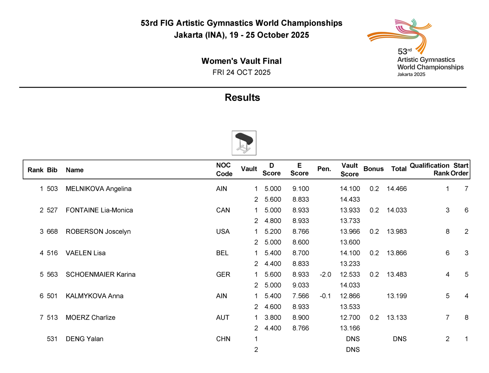 Here’s a detailed look at the top-3 results from the Women’s Vault Final at the 2025 World Artistic Gymnastics Championships in Jakarta: